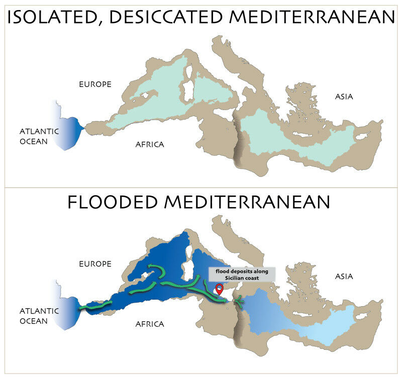 Geologists from Utrecht, London and Granada have found the first direct proof of the largest known mega-flood that ever occurred on earth. This mega-flood ended what is known as the ' Messinian Salinity Crisis' , a period around six million years ago when the water level in the Mediterranean Sea sank by around 1.5 km, causing an extreme environmental crisis in the region. The authors studied sandstone that was exposed along the southern coast of Sicily and concluded that it was formed by a powerful flow from the western Mediterranean Sea towards the east. The water flowed over a barrier that separated what were then isolated basins in the western and eastern Mediterranean region. Their research was recently published in the journal Sedimentology . The waters of the Mediterranean Sea and the Atlantic Ocean flow back and forth and mix via the narrow Straits of Gibraltar. During the Messinian era, around six million years ago, this flow was disrupted by a tectonic closure of the straits.