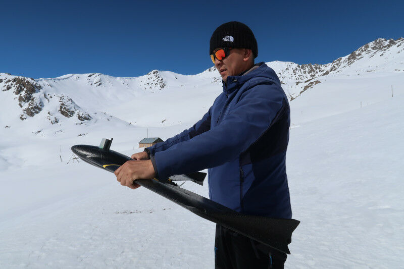 CROMO-ADAPT colleague Sultan Belekov from Kyrgyz Hydromet ready for take-off! (Photo: Yves Bühler / SLF) SLF-scientists Joel Caduff and Yves Bühler trained scientists and practitioners in drone-based snow depth mapping in the Kyrgyz mountains. After packing a lot of equipment including ski touring sets and an eBee-X drone, we boarded the plane to Istanbul on March 29 and then to Biskek, the capital of Kyrgyzstan. There our project partner Sultan Bekelov from the Kyrgyz Hydrometeorologcal Agency ( Kyrgyz Hydromet ) picked us up and drove us to a hotel for a good sleep after the 14 hours trip. The next morning, we visited the Kyrgyz Hydromet Headquarters and the Central Asian Institute of Applied Geosciences. After a lot of tea with the directors of the institutes we demonstrated the eBee X drone, originally developed by a spin-off company from ETH Lausanne, to the staff. We could see their excitement for flying this new toy immediately, and they were very eager to assemble it. At Too-Ashuu pass road - Joel is ready to go up to the station.