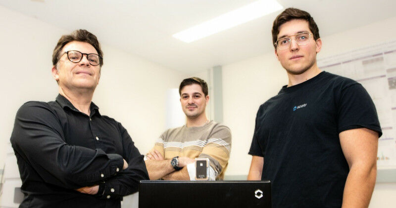 Chemistry professor Francois Lagugné-Labarthet (left) is working with a startup company called SCATR Inc., founded by Western grad Ari Forman, BSc’20, (centre) and Alex Boukin. The team is working together to pilot and research the effectiveness of the technology at 11 sites across Canada. (Christopher Kindratsky/Western Communications)