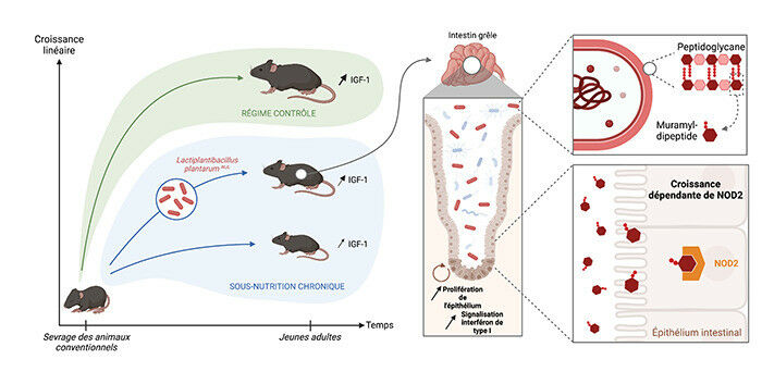 The LpWJL bacterial strain enhances growth of undernourished mice via signalling triggered by intestinal NOD2 receptor recognition of muramyl dipeptide from the bacterial cell wall. © Amélie Joly 1 While insulin-like growth factor 1 (IGF-1), mainly produced by the liver, has a chemical structure similar to that of insulin, these hormones have distinct functions: IGF-1 stimulates tissue and skeletal growth, whereas insulin regulates energy metabolism as required for growth. The gut microbiota is now thought to constitute an organ in its own right. The work of a team led by scientists from the CNRS and ENS de Lyon, in collaboration with Claude Bernard Lyon 1 University, INSERM, and INRAE, is the subject of an upcoming article in Science . These researchers have learned how a certain microbiotic bacterial strain stimulates the growth of undernourished young animals. Though essential for health, microbiotic activity is still poorly understood. Through earlier studies, an international research team, 1 directed by scientists from the Institute of Functional Genomics of Lyon (CNRS / ENS de Lyon), demonstrated that the gut microbiota plays a key role in the growth of juvenile individuals belonging to species as different as drosophilas and house mice.