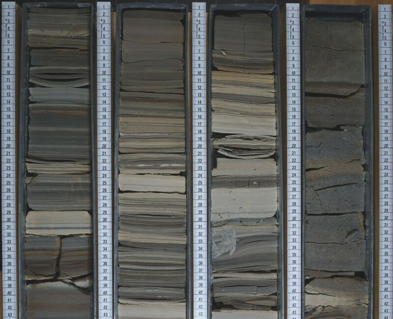 Drill core from borehole taken in 1981 from the Nördlinger Ries. There are distinctive layers of light-coloured dolomite between fine-layered dark sediments of the former crater lake. Photo: Gernot Arp, Göttingen University