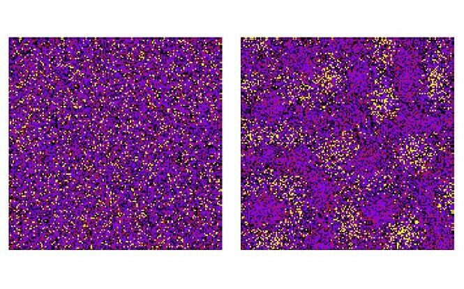 A small composition imbalance ( left ) results in one component ( yellow ), which is just slightly more prevalent than the other ones, driving the phase separation in the mixture ( right ). Photo: Filipe Thewes Göttingen researchers use mathematical model to identify new mechanism for control of phase separation The very first life on earth is thought to have developed from -protocells liquid mixtures of many different types of molecules. Researchers from the University of Göttingen have now shown that in such mixtures, small imbalances in the number of molecules of different types can have an unexpected effect. A surprising interplay with the complex pattern of interactions strongly amplifies such imbalances - meaning that a type of molecule that is only slightly in the majority can almost entirely separate out from the others. These fundamental findings point towards a new mechanism that will apply in many complex mixtures. For instance, this would be a way for cells to control the formation of structures by fine-tuning the concentration of different molecules. The research was published in Physical Review Letters .