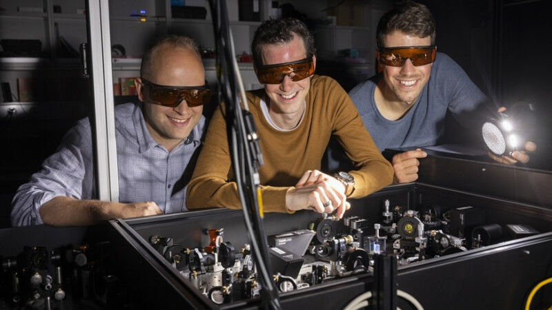 Lysander Huberich (left), team leader Bruno Schuler (middle) and optics specialist Jonas Allerbeck at the THz optics, which generates picosecond-precise excitation pulses. Image: Empa
