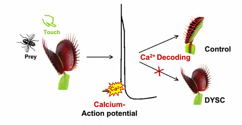 Stimulation of the Venus flytrap by touch triggers electrical signals and calcium waves. The calcium signature is decoded; this causes the trap to shut quickly. The DYSC mutant has lost the ability to read and decode the calcium signature correctly.