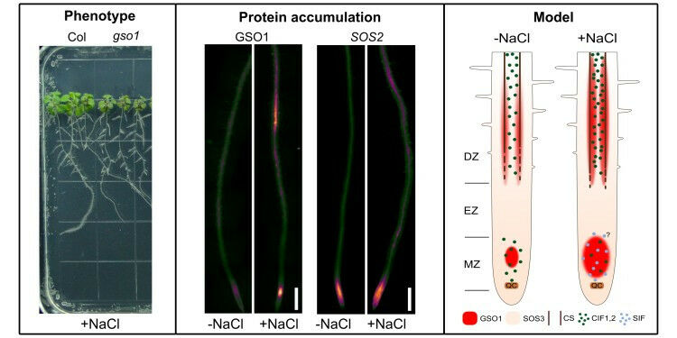 Newly discovered signalling pathway specifically protects the stem cells in the plant root from salt stress. GSO1 is important for plant salt stress tolerance. Left: Loss-of-function mutants of GSO1 (gso1) exhibit reduced root and shoot growth in the presence of salt stress as compared to wildtype (Col). Middle: Salt stress induces enhanced GSO1 receptor kinase accumulation specifically in the root tip meristem and in the endodermis of the differentiation zone. The kinase SOS2 is present in the whole root; its protein accumulation is evenly enhanced upon salt stress. Right: Model of salt stressed Arabidopsis roots. Chen C. et al./The EMBO Journal (2023)e113004 A high content of sodium-containing salts in the soil is a problem for many plants: as a result, they grow less well, or not at all.