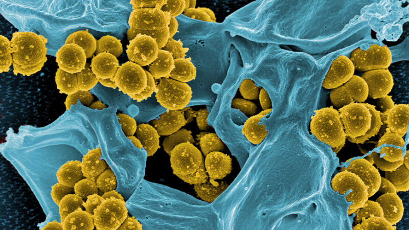 Antibiotic-resistant staphylococci (yellow) are fought by a white blood cell (blue). Image: Electron microscopy (NIAID), digitally colored (Empa)
