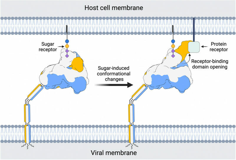 Proposed model for how human coronavirus HKU1 engages the host cell. The spike protein tilts towards the host cell membrane so that it can bind to its primary sugar receptor.