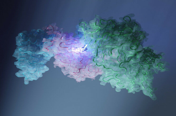 A molecular glue (in white) brings together two cell cycle regulators (purple and blue) with an enzyme (green) that tags them as waste. Image credit: Georg Kempf/Thomä lab/FMI