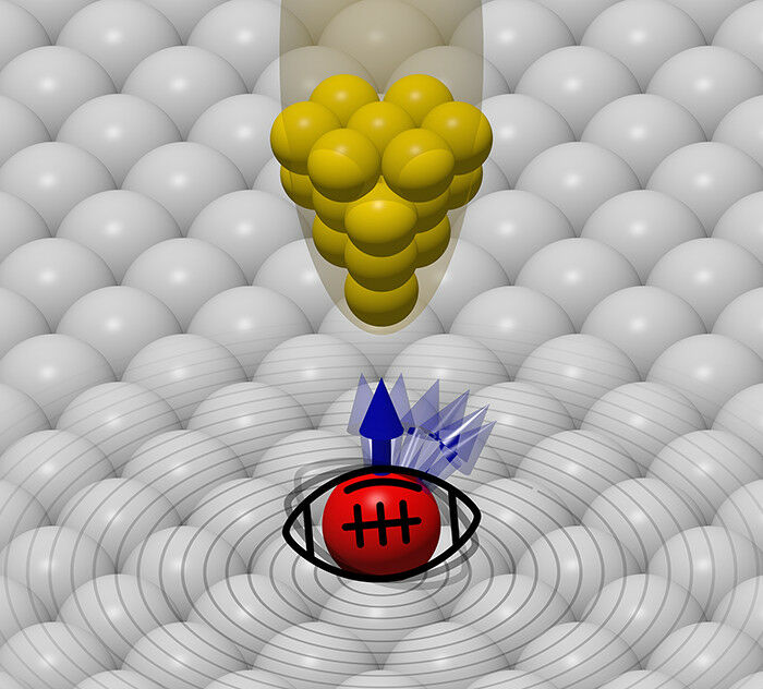 The cobalt atom (red) has a magnetic moment (’spin,’ blue arrow ), which is constantly reoriented (from spin-up to spin-down) by an external magnetic field. As a result, the magnetic atom excites the electrons of the copper surface (gray), causing them to oscillate (creating ripples). This revelation by the Würzburg-Dresden Cluster of Excellence ct.qmat was made possible thanks to the physicists’ inclusion of an iron tip (yellow) on their scanning tunneling microscope. (Image: Juba Bouaziz / Ulrich Puhlfürst)