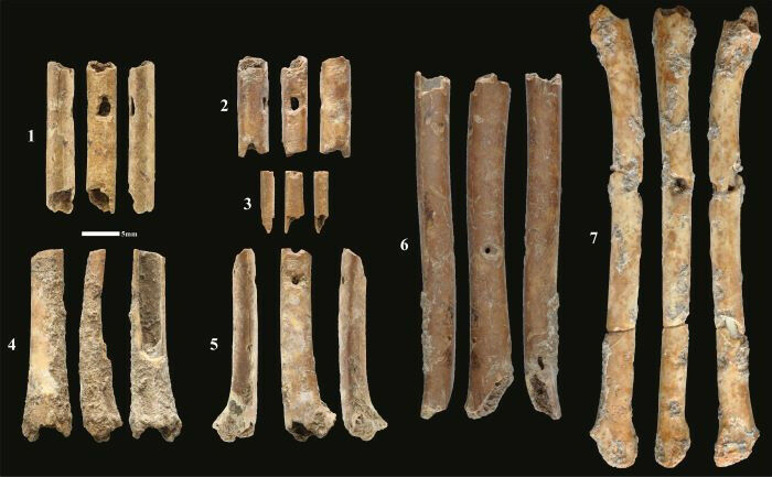 The seven aerophones discovered at Eynan-Mallaha © Laurent Davin Although the prehistoric site of Eynan-Mallaha in northern Israel has been thoroughly examined since 1955, it still holds some surprises for scientists. Seven prehistoric wind instruments known as flutes, recently identified by a Franco-Israeli team 1 , are the subject of an article published on 9 June in Nature Scientific Reports . The discovery of these 12,000-year-old aerophones is extremely rare - in fact, they are the first to be discovered in the Near East. The "flutes", made from the bones of a small waterfowl, produce a sound similar to certain birds of prey (Eurasian sparrowhawk and common kestrel) when air is blown into them. The choice of bones used to make these instruments was no accident - larger birds, with bigger bones that produce deeper sounds, have also been found at the site. The Natufians, the Near Eastern civilisation that occupied this village between 13,000 and 9,700 BC, deliberately selected smaller bones in order to obtain the high-pitched sound needed to imitate these particular raptors. The instruments may have been used for hunting, music or to communicate with the birds themselves.