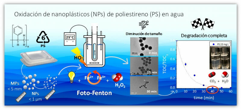 Graphical abstract of the article published in JECE (doi: 10.1016/j.jece. Researchers at the Autonomous University of Madrid (UAM) have developed a process based on the photo-Fenton method that allows the efficient degradation of polystyrene nanoplastics in water. This breakthrough could be key in the fight against plastic pollution, especially in wastewater treatment plants (WWTP). A team of environmentalists, chemists and chemical engineers from the Universidad Autónoma de Madrid (UAM) and the Universidad Nacional de Mar del Plata (Argentina) has investigated the application of the photo-Fenton treatment method to degrade polystyrene nanoplastics in water. This method combines a light source (UV-Vis radiation) with low concentrations of iron (as a homogeneous catalyst) to activate the decomposition of hydrogen peroxide (H2O2) into highly oxidizing species. These species can degrade various persistent pollutants into harmless molecules, such as carbon dioxide and water, operating under ambient conditions. The results, published in the Journal of Environmental Chemical Engineering , reveal that the photo-Fenton process achieves complete and rapid degradation of polystyrene nanoplastics in water, significantly exceeding the removal levels of other photocatalytic processes mentioned in previous studies.