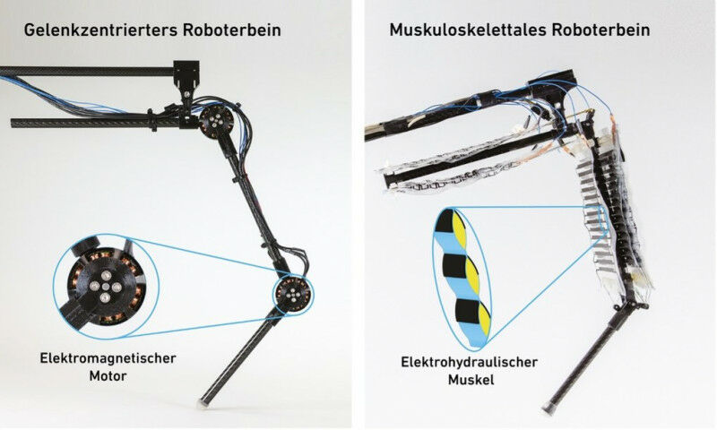 As in humans and animals, an extensor and a flexor muscle ensure that the robotic leg can move in both directions. These electro-hydraulic actuators, which the researchers call HASELs , are attached to the skeleton by tendons.