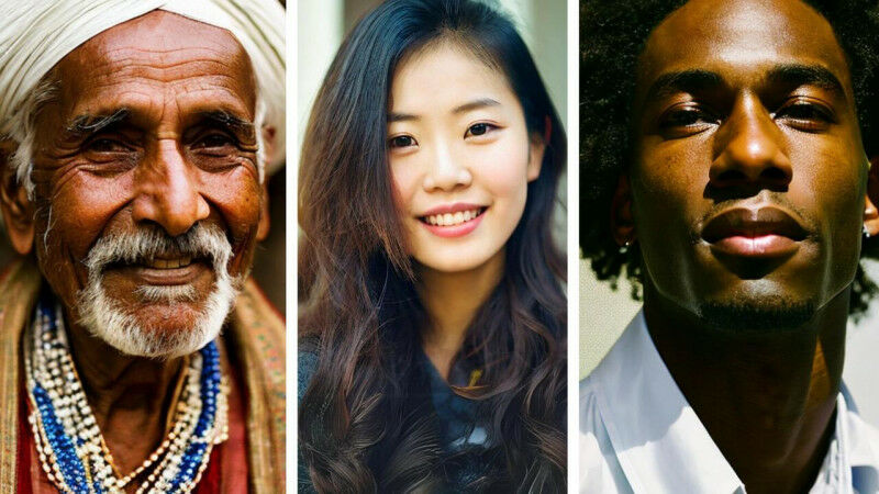 AI-generated images of an Indian man, an Asian woman and a Black man.