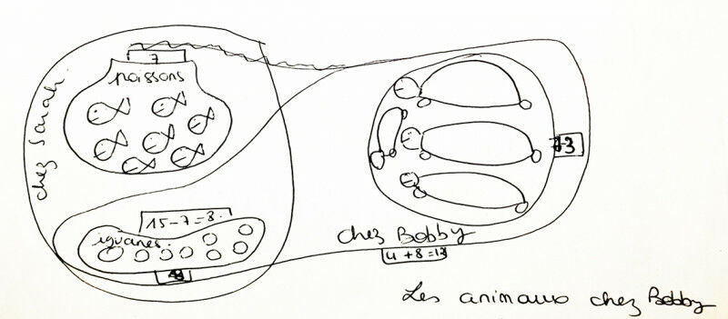 Drawing by a participant highlighting the cardinality of numbers by using sets of grouped elements (animals). This type of drawing is generally accompanied by a 3-step solution.