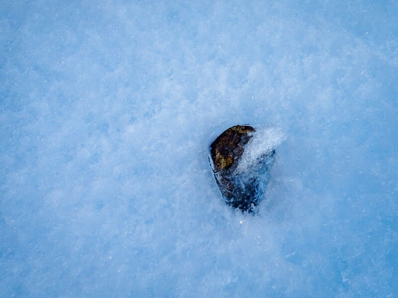 For this reason, co-leader of the study and glaciologist Harry Zekollari from WSL and ETH Zurich recommends that the collection of Antarctic meteorites should be accelerated. «Currently, five times more meteorites are disappearing from the Antarctic surface than can be collected,» says Zekollari. «To preserve this valuable extraterrestrial material, we need to intensify and coordinate the collection of Antarctic meteorites before we lose them to climate change.» This is similar to what is already happening in collecting ice cores from shrinking glaciers or sampling coral reefs before they bleach. But even more important is the rapid reduction of greenhouse gas emissions to reduce global warming and thus preserve most of the Antarctic meteorites on the surface in the long term. The dark color causes the meteorites to heat up. This and high temperatures favor the sinking into the ice. (Photo: Katherine Joy, The University of Manchester) The sinking of the meteorites is partly due to their dark colour. «Even at temperatures well below freezing, the dark meteorites heat up so much in the sun that they can melt the ice directly beneath the meteorite. In this process, the warm meteorite creates a cavity in the ice and disappears completely below the surface over time,» says Veronica Tollenaar, co-leader of the study from the Université libre de Bruxelles. As the temperature of the atmosphere rises, the surface temperature of the ice also increases, which accelerates this process because less heat from the meteorites is needed to melt the ice locally.