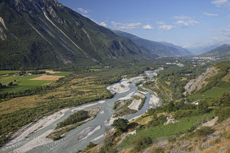View from Varen church of the Pfynwald floodplain with the Rhone (looking downstream), gravel banks and dry gravel terraces with pine forest. (Photo: Jan Ryser/BAFU)