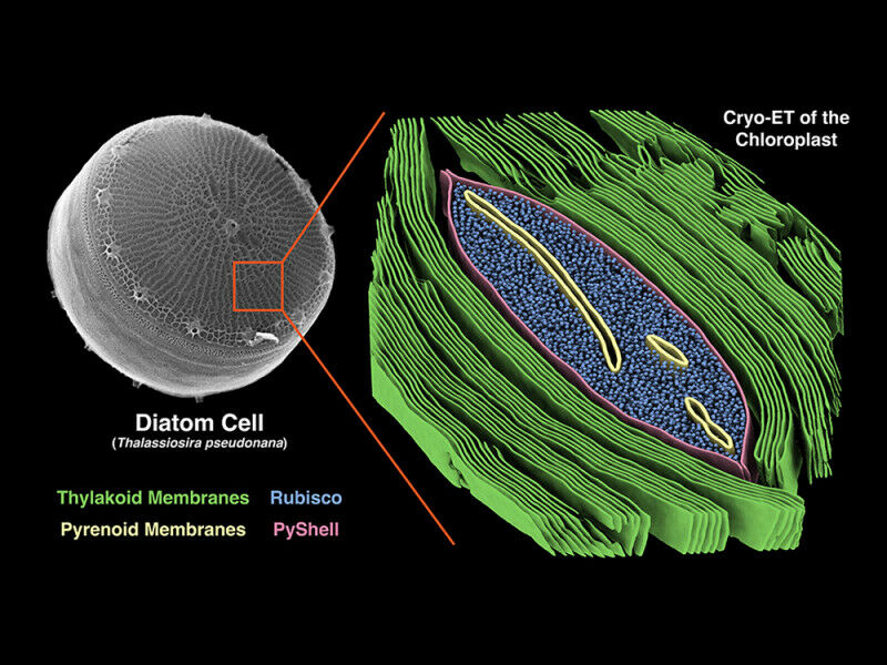 In plants and algae, photosynthesis takes place in chloroplasts. Inside these chloroplasts, energy from sunlight is harvested by thylakoid membranes and then used to help the enzyme Rubisco fix CO2.However, algae have an advantage: they pack all their Rubisco into small compartments called pyrenoids, where CO2 can be captured more efficiently. "We have now discovered that diatom pyrenoids are encased in a lattice-like protein shell," says Dr. Manon Demulder, author on both studies. "The PyShell not only gives the pyrenoid its shape, but it helps create a high CO2 concentration in this compartment. This enables Rubisco to efficiently fix CO2 from the ocean and convert it into nutrients."