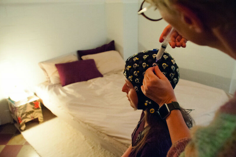 To measure brain waves, from which the researchers can derive the personal sleep profile, a test person is fitted with electrodes at home so that she can sleep in familiar surroundings.