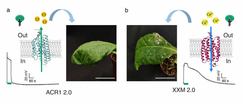 Point 3: The expression of chanelrhodopsin in tobacco cells often causes difficulties. In 2021, the Würzburg team of scientists succeeded in expressing the light-activated anion channel GtACR1 in tobacco plant cells. As a result, Georg Nagel’s team was able to develop various channelrhodopsins that were optimized for the permeability of calcium ions. Finally, Dr. Shiqiang Gao and Shang Yang, both members of Nagel’s group, succeeded in developing a very good calcium-conducting channelrhodopsin XXM 2.0 for targeted expression in tobacco plants.