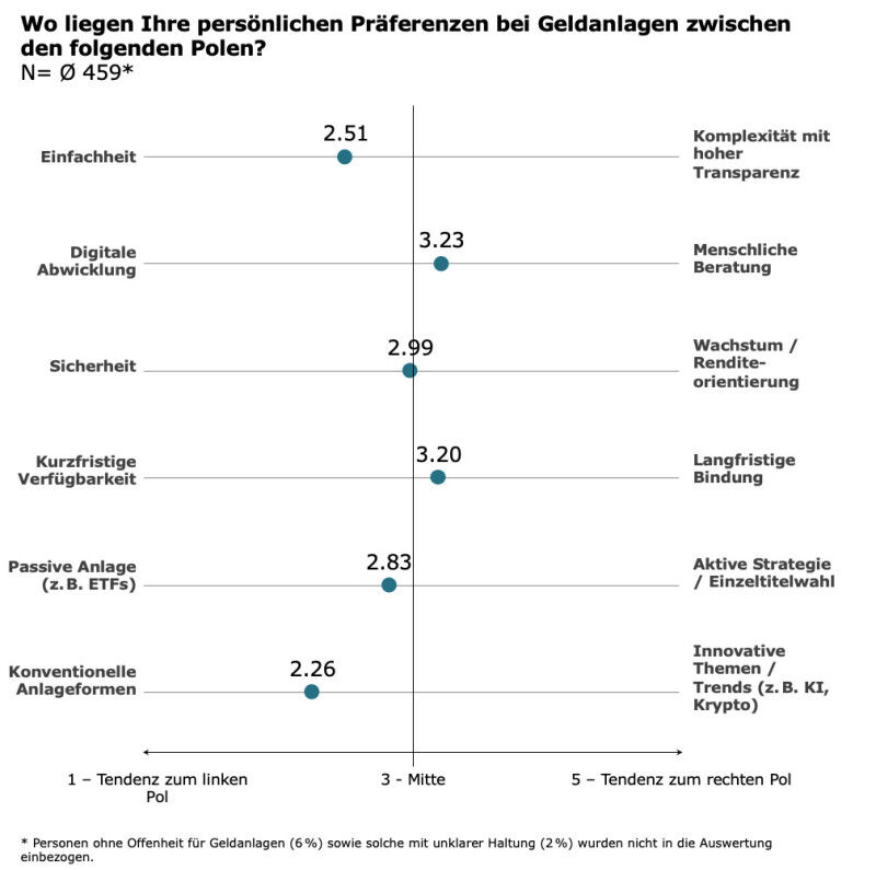85 percent of respondents are already investing or are open to doing so. However, many only have limited knowledge - especially when it comes to future topics such as artificial intelligence (Ø 2.45), cryptocurrencies (Ø 1.63) or ESG investments (Ø 2.37). Around half of respondents are interested in additional financial education.