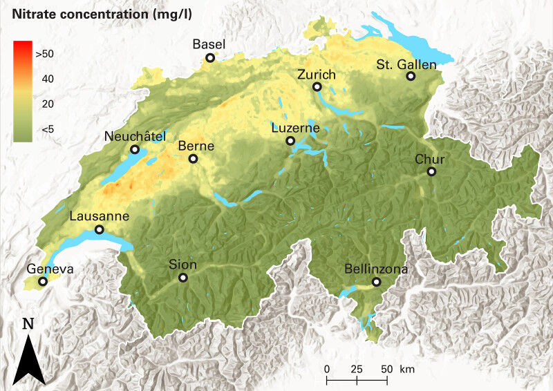 Researchers are using machine learning to map nitrate pollution in Swiss groundwater. This allows gaps in the measurement network to be filled and the causes of excessive values to be identified. The study is part of a larger project analysing the nitrogen cycle in Switzerland.
