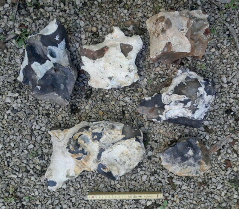 Local, highly irregular flint blocks from alterites and/or biefs overlying the limestone bedrock of the Chartres plateau. M. Brenet, Inrap