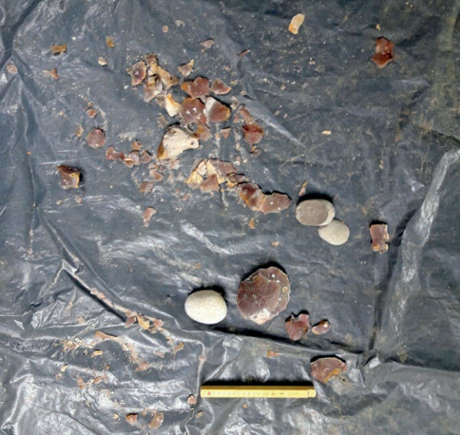 An example of experimental Levallois flake knapping on local flint. Note the fineness and homogeneity of the material and the numerous frosted fragments. Experimental test and photo, M. Brenet, Inrap