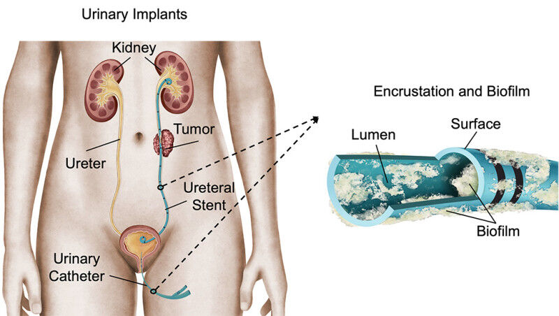 Urinary stents and catheters are implanted medical tubes that are widely used in human and veterinary medicine to drain urine to/from the bladder. Ureteral stents are used when the ureter, the duct between the kidney and bladder, is blocked by tumors, pregnancy, stones or anatomical narrowing. Biofilm, produced by bacteria, and crystalline deposits, called encrustation, grow on the inner and outer walls of such stents and catheters soon after implantation and are among the main causes of failure of these devices because they lead to painful blockages and urinary infections. To mitigate these issues, urinary stents and catheters therefore must be replaced every two to six months, which not only considerably restricts the quality of life of those affected but also leads to high hospital load and costs.