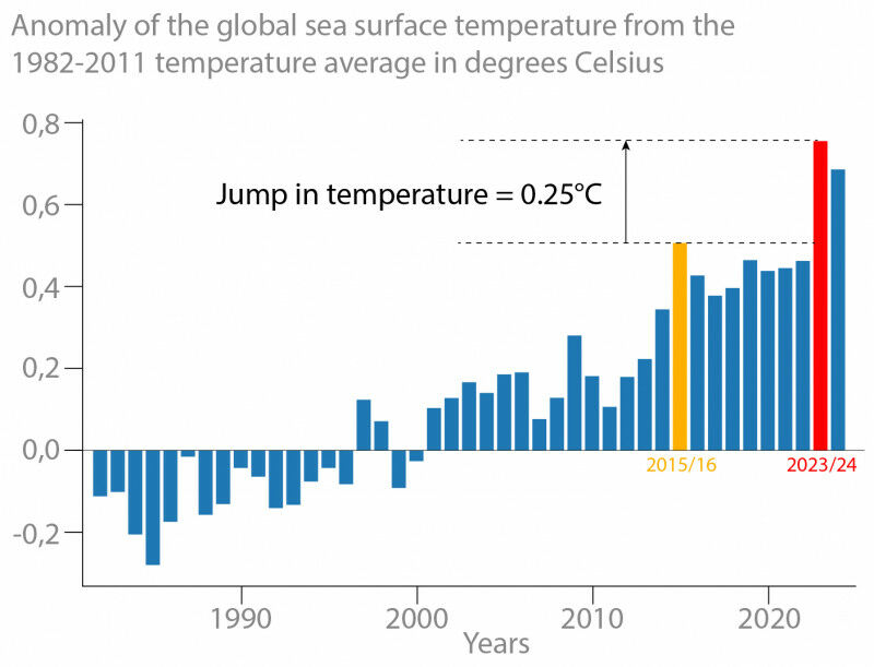 Global sea surface temperatures reached new records between April 2023 and March 2024, exceeding all previous highs by an unprecedented margin of 0.25 degrees Celsius. Many researchers were surprised by the magnitude of the rise in temperatures, as the El Niño phenomenon, which has a warming effect, was not exceptionally strong during these years. Based on this development, researchers suspected that other factors besides climate change and El Niño could play a role, or that climate change is progressing faster and more strongly than previously assumed.