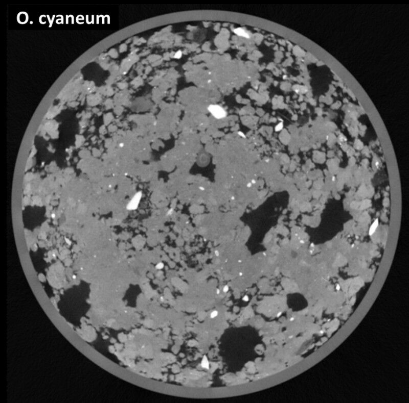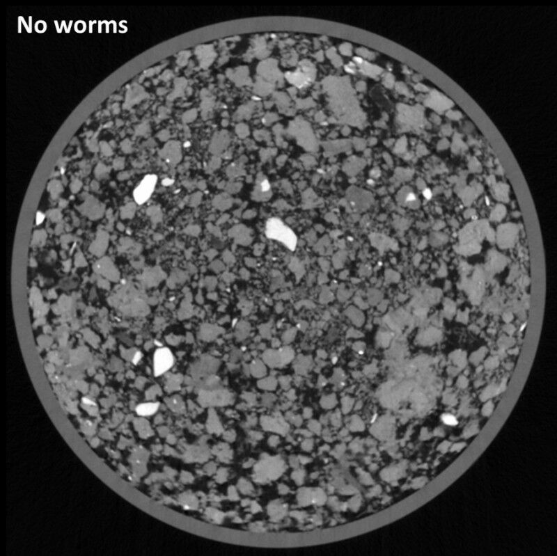 De Jong shed light on the underground workings of earthworms with X-ray images of the plastic tubes. Depending on the species, the worms dig either vertically or horizontally. The widespread commom earthworm (Lumbricus terrestris) forms vertical tunnels, pulls leaves into the depths, eats and digests them. However, it only inhabits a small part of the soil. The horizontally burrowing, blue-grey worm (Octolasion cyaneum), on the other hand, digs through the entire soil space, eating only soil and the microorganisms that live in it. Both species often occur together in nature. De Jong suspects that they store the most carbon in the soil when they work together.