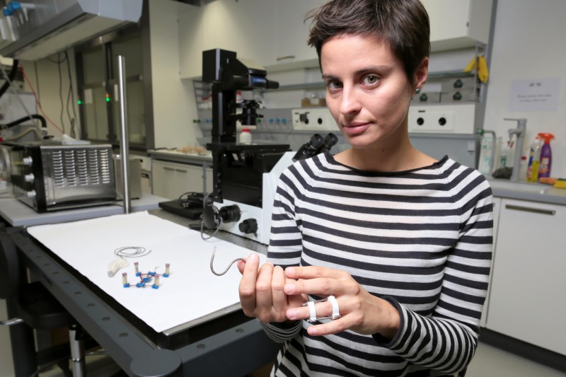 EPFL scientists have developed a new type of composite thread that varies in stiffness depending on its temperature. Applications range from multifunctional robots to knitted casts, and even tunable medical devices. A new type of thread has been developed at EPFL that varies in stiffness depending on its temperature. This new structure could be used in future robots, orthopedics and even medical devices for biopsy. The results are now published online in Advanced Materials. A drone that integrates these threads of variable stiffness can morph from a flying device into a robotic car : the motors can be used as either propellers or as wheels, depending on their position which can be adjusted thanks to the threads. When knitted, the thread could be used as an electronic cast for rehabilitation of broken joints.