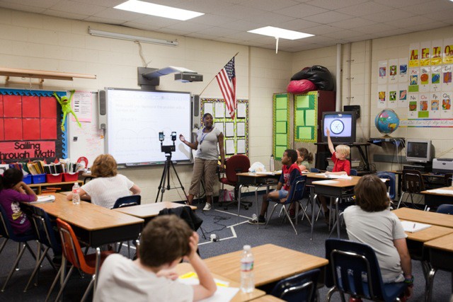A teacher engages with students in a classroom. Image credit: U-M Measures of Effective Teaching Project.
