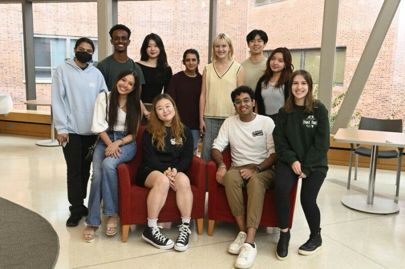 A group of students stand and sit as they pose for a photo