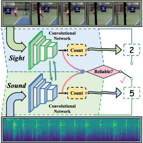 Figure 1: From sight and sound, as well as their cross-modal interaction, the number of repetitions for an (unknown) activity happening in a video is predicted. There are two streams, and each stream processes each modality with a convolutional neural network. The reliability estimation module finally decides what prediction from which modality to use, according to the perceived quality of each modality. Counting repetitive phenomena by the use of sight and sound 28 June 2021 Recently, an article from researchers from the Informatics Institute of the University of Amsterdam has been published at the IEEE Conference on Computer Vision and Pattern Recognition; the leading peer-reviewed publication venue in the field of artificial intelligence. The researchers introduced a method for counting repetitions, which are relevant when analyzing human activity (sports), animal behavior (a bee's waggle dance) or natural phenomena (leaves in the wind) by integrating for the first time the audio modality in a visual counting system based on neural networks. VIS) , in collaboration with Ling Shao from the Inception Institute of Artificial Intelligence ( IIAI ), developed a method for estimating how many times a certain repetitive phenomenon, such as bouncing on a trampoline, slicing an onion, or playing ping pong, happens in a video stream. Their methodology is applicable to any scenario in which repetitive motion patterns exist.