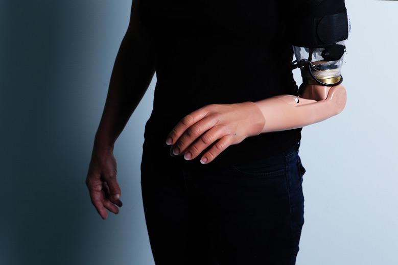An amputee fitted with an advanced arm prosthetic following TMSR surgery (credit: Irit Hacmun, Tel Aviv)