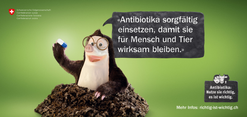 The FOPH, FSVO, FOAG and FOEN have launched a campaign to raise awareness among the Swiss population about the responsible use of antibiotics. Antibiotics save lives Antibiotics are drugs that kill bacteria or inhibit their growth. They are therefore an important medical weapon in the fight against bacterial diseases in humans and animals. However, bacteria can get used to antibiotics and become antibiotic-resistant if they are used too often or incorrectly. The problem of antibiotic resistance affects human medicine, veterinary medicine, agriculture and the environment. Raising public awareness of the correct use of antibiotics The campaign, which runs through 2021, aims to raise awareness among the entire Swiss population about the proper and responsible use of these drugs. Television commercials, posters and banners will feature a mole, a dog and a frog who explain how to use antibiotics: "Antibiotics: it is important to use them responsibly." The campaign is part of the National Strategy on Antibiotic Resistance (StAR).