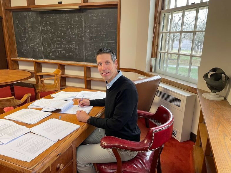 Székelyhidi is currently researching in the Einstein Room at the Institute for Advanced Study. Photo: private - It's a great honour for mathematician Professor László Székelyhidi from Leipzig University: since last September he has been spending the academic year at the Institute for Advanced Study (IAS) in Princeton. In his role as Distinguished Visiting Professor, he has the opportunity to work in the famous room where Albert Einstein once conducted research. The institute was the final place where Einstein worked and a refuge for many other scientists who had fled Germany. Thanks to Einstein, the "father of modern physics", the Institute for Advanced Study became one of the most famous research centres in the world. "On the one hand, I am simply awestruck. On the other, it is just an office - albeit a very large one in the Institute's historic building - so large, in fact, that I can also play the occasional string quartet with my colleagues in the room.