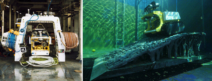 On the right, Bathybot in its dock aboard the Pourquoi Pas? A 50 m blue cable connects the rover to the dock, which is in turn connected to the scientific junction box, and to the rest of the network via the orange cable. © Cyril Frésillon / MIO / CNRS Photo library On the left, BathyBot and BathyReef in the IFREMER Mediterranean Centre test basin.