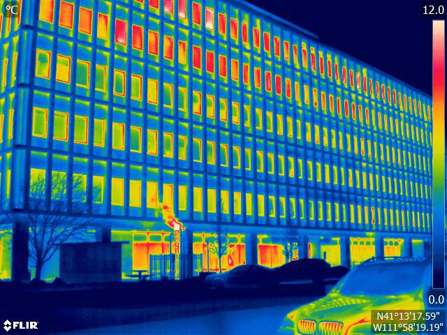 A thermal image of the Hansen Federal Building in Ogden, Utah, where Berkeley Lab performed a window retrofit study. (Credit: Berkeley Lab Windows and Envelope Materials Group)