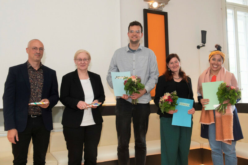 Gender Studies Prize 2022 awarded - From left to right: Professor Andreas Krebs (member of the jury), Professor Marion Gymnich (member of the jury), Luis Kumpfmüller (award winner), Laila Riedmiller (award winner) Michaela Doutch (award winner).