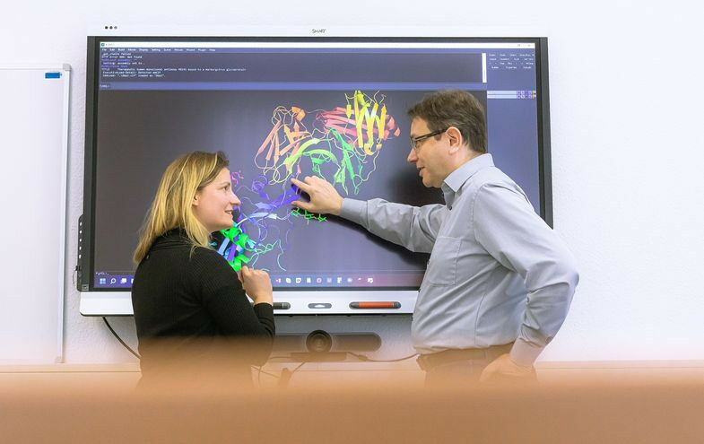 Humboldt Prof. Jens Meiler and project manager Dr. Clara T. Schoeder analyze protein structures. Photo: Swen Reichhold