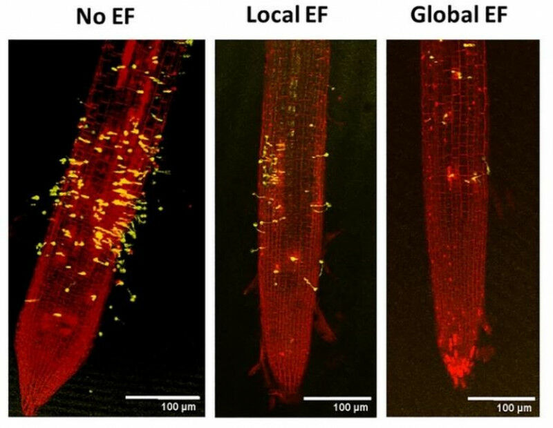 In earlier work , the same group quantified this electrotactic behaviour, revealing how P. palmivora spores are attracted to positive electrodes. Now, the group show that placing a device that generates such a field near the roots of plants like Arabidopsis and Medicago can significantly reduce the number of spores that attach to them.