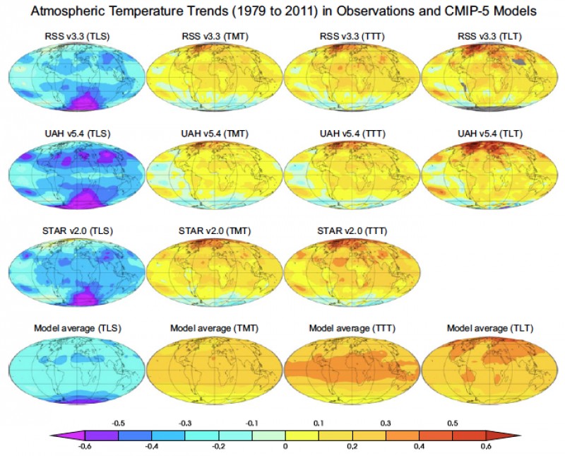 Geographical patterns of observed and simulated trends (in degrees Celsius per decade) from 1979 to 2011. Abbreviations stand for the lower stratosphere (TLS), the mid- to upper troposphere (TMT), and the lower troposphere (TLT). The observations are measurements of microwave emissions made by microwave sounding units (MSUs) on polar-orbiting satellites. MSU-based temperature data came from three different observational groups: Remote Sensing Systems (RSS), the University of Alabama at Huntsville (UAH), and the Center for Satellite Applications and Research (STAR) in Maryland. (Courtesy Benjamin Santer, LLNL)