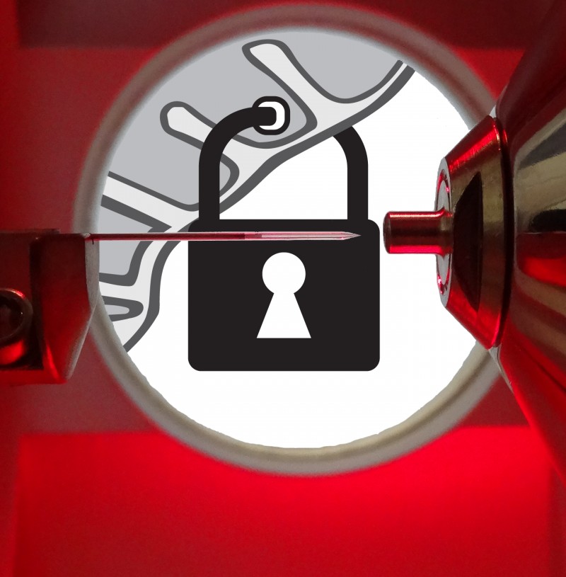 Zoom-in of an electrospray capillary (left) transferring proteins into the orifice of a mass spectrometer (right). Using this technology, the scientists analyzed mitochondria with a "gate" closed for proteins (cartoon) at molecular level.