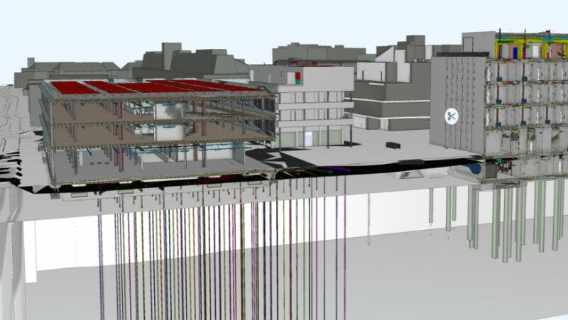 The buildings of the future campus in a digital model: Under the laboratory building on the right, you can see the foundation pillars that transfer the loads to deeper soil layers; on the left, geothermal probes go even deeper. Image: Cadmec AG / Empa - Digital construction using Building Information Modeling - BIM for short - is a trend for the future: more efficient, less expensive and more transparent, from design to operation of the building. The new Empa and Eawag research campus is now being built with the help of a digital twin, which will also simplify facility management of the new buildings. Around 3,800 cubic meters of concrete for foundations and floor slabs under the building, more than 2,450 square meters of windows and almost 13,000 meters of electrical cables: information about the current planning status of the future Empa research campus, delivered with just a few mouse clicks - with the help of a digital model. This is the nucleus for a completely virtual twin that makes detailed planning, execution and operation more efficient. Building services in the new laboratory building: The heating systems are shown in orange, ventilation in blue, sanitary systems in red and electrical lines in yellow. Image: Cadmec AG/ Empa - This way of working is based on the BIM method, which has become increasingly important in recent years (see info box).