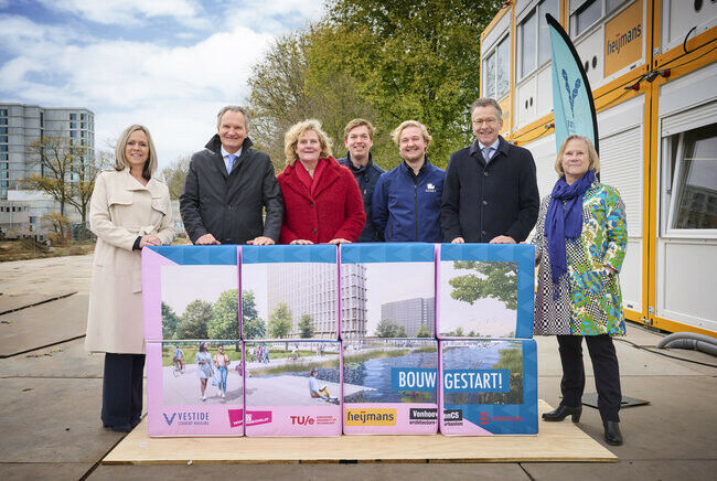 Vice-president of TU/e Nicole Ummelen ( left ), president of TU/e Robert-Jan Smits, alderman Mieke Verhees, students Thomas Lippens and Sidney den Engelsman, mayor Jeroen Dijsselbloem and director of Woonbedrijf Ingrid de Boer. "This project is a great example of how we can achieve extra student housing together with our stakeholders in Brainport." Housing corporation Woonbedrijf and construction company Heijmans have started the construction of 735 student homes on the TU/e campus. This project will be completed in the summer of 2024 and will consist of 366 rooms, 285 studios and 84 apartments and various facilities. Today partners involved in the project held the kick-off event. Important role for students. This project enables us to make an important contribution to pleasant, affordable homes for students. This is needed now more than ever,- says Ingrid de Boer, general director/manager of Woonbedrijf.