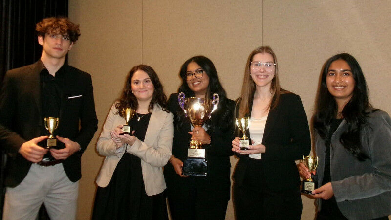 After participating in many intercollegiate tournaments across Ontario and finishing shy of a trophy more than once, the team was thrilled to hear they had finally won. "Something I’ve learned through mock trialing is you only really get better through your losses," says Noah Desario, who co-captained the OMTA tournament alongside Ventura.