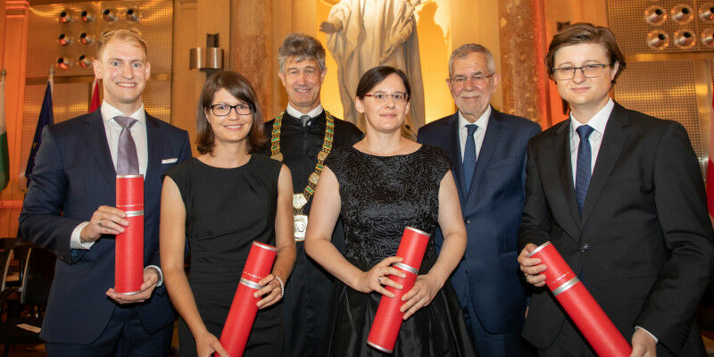 Rector Harald Kainz and Federal President Alexander Van der Bellen (2nd row from left) congratulate Robert Triebl, Anna Eibel, Maria Eichlseder and Peter Peßl (from left) on their record performances.
