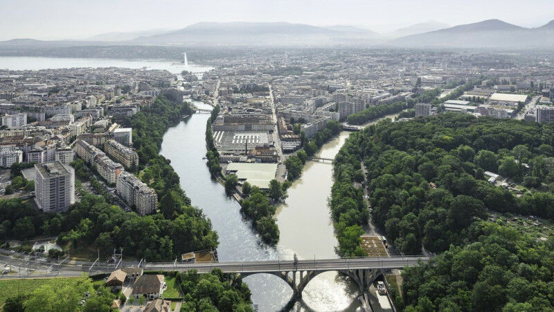 Aerial view of the Rhone river in Geneva.