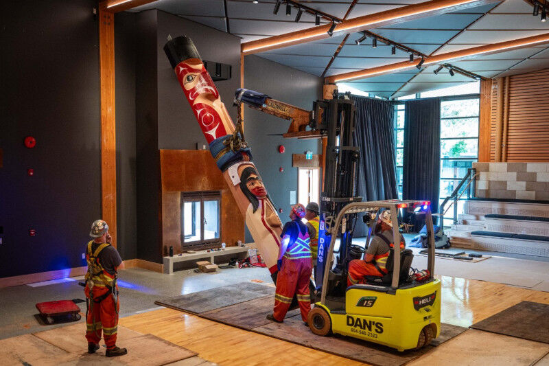 Sparrow is overseeing the delivery of his post, which has made the relatively short trip from his workshop on traditional xwm?’kw’y?m (Musqueam) territory to the university campus.